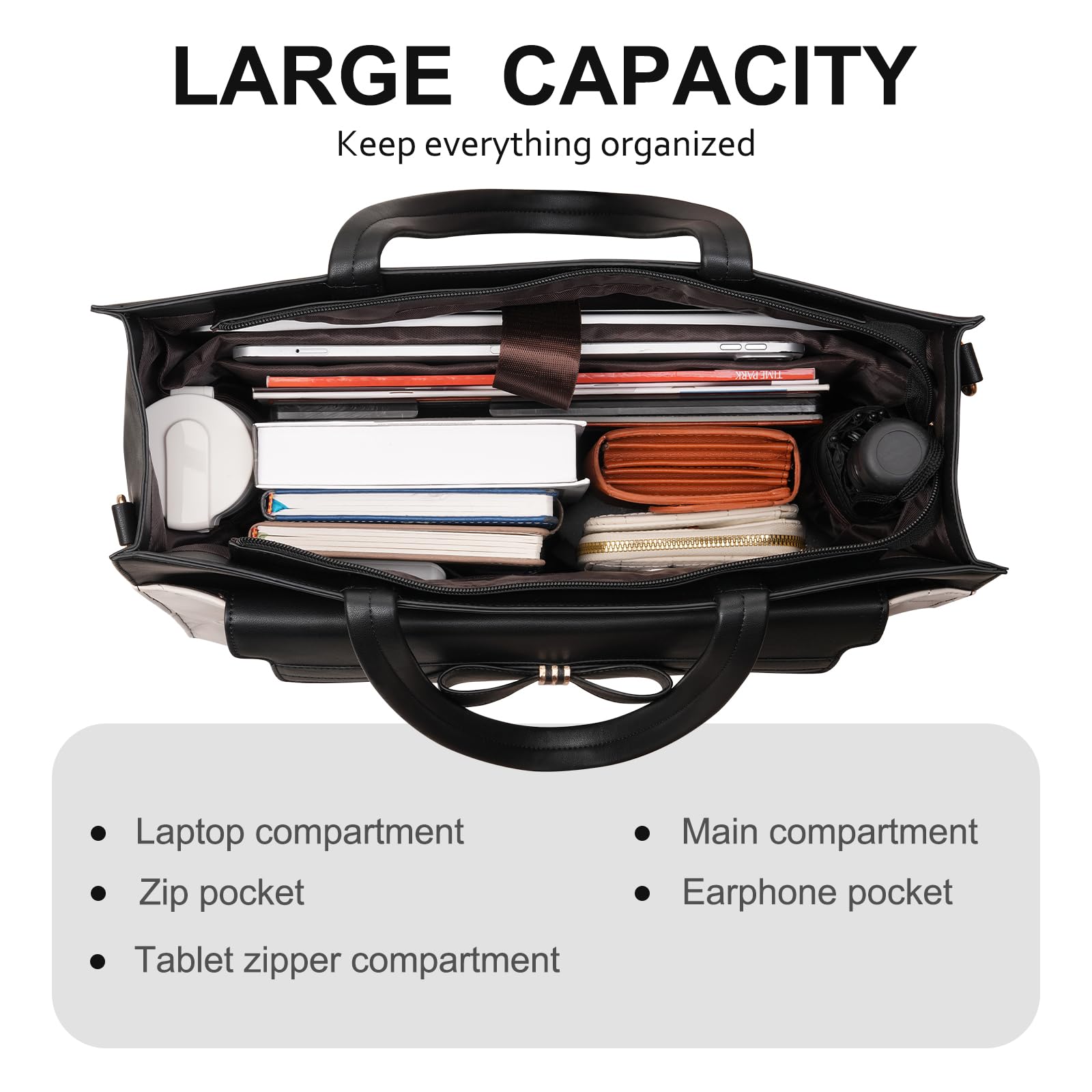 - Large Capacity & Multiple Compartments. This tote bag holds your laptop, tablet documents and book. 3 square pocket, 2 pen pockets; 2 side cup pockets for water bottle inside. Extra small clutch purse to keep your mobile phone, keys, cards, and makeup. Whether you are working, commuting, or daily use, It is an ideal bag for women on the go.