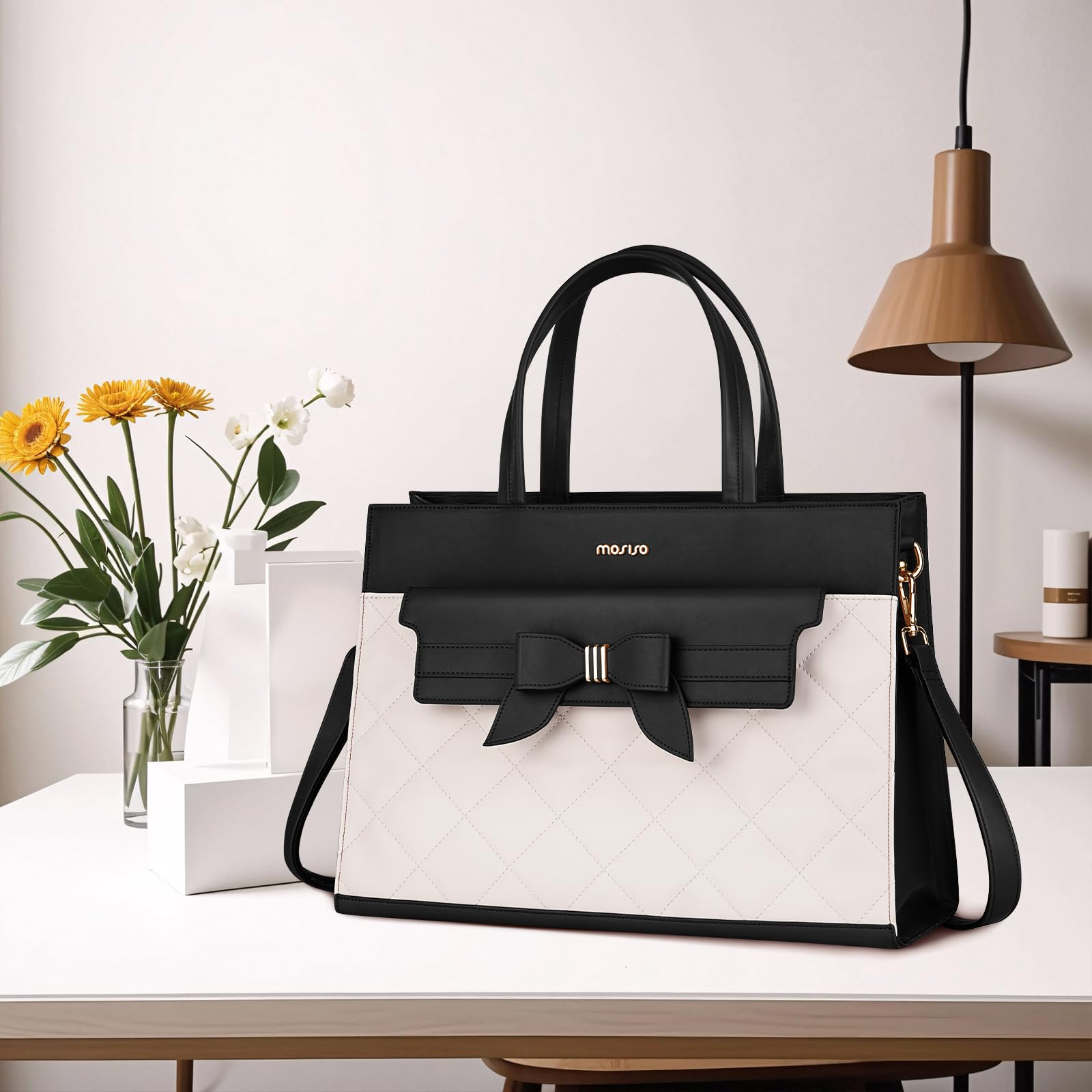 MOSISO Laptop Tote Bag, 15.6 inch PU Leather Flapover Pocket Tote Bag & Clutch Purse, Work Bag with Bowknot for Women, Waterproof Computer Briefcase for Business Office, Black