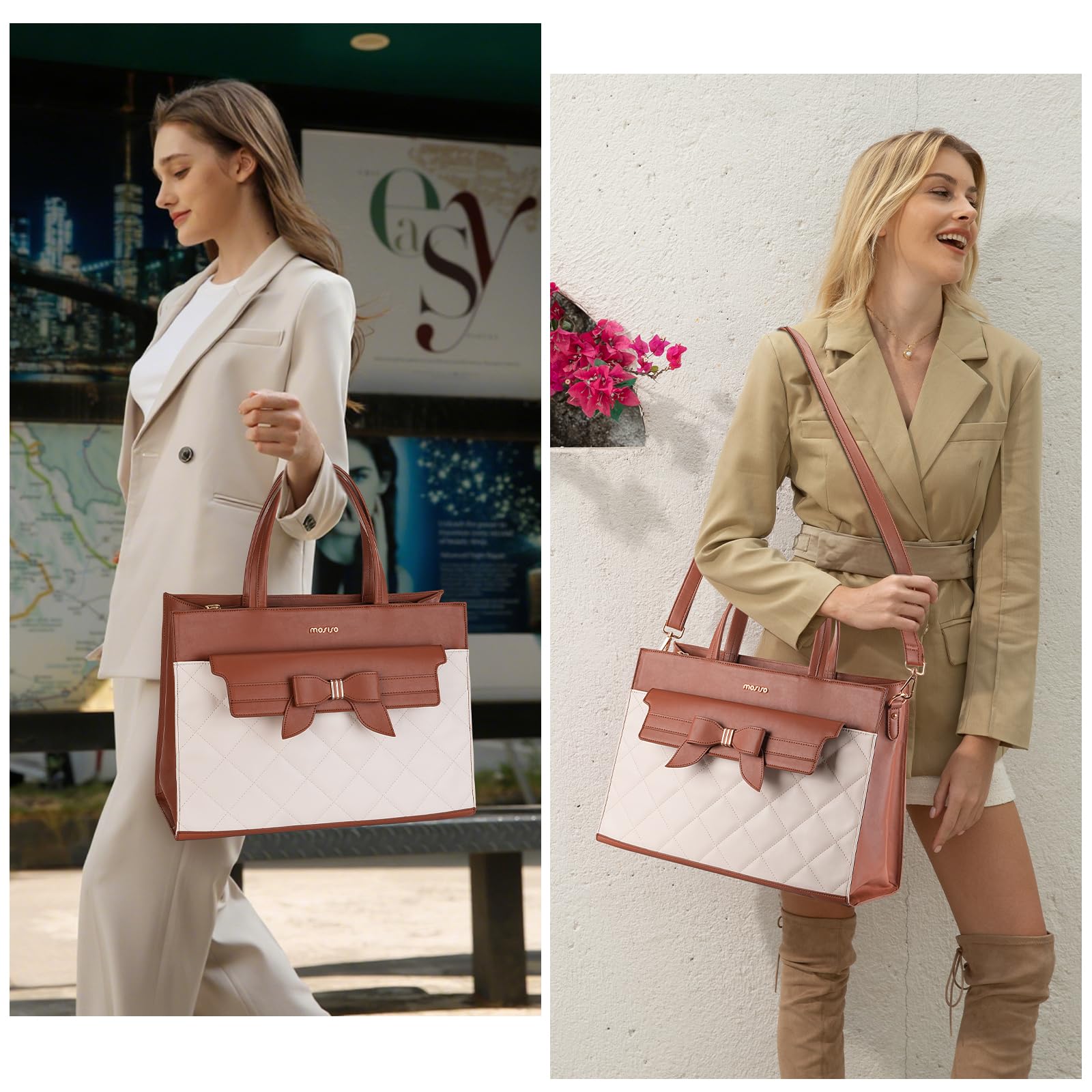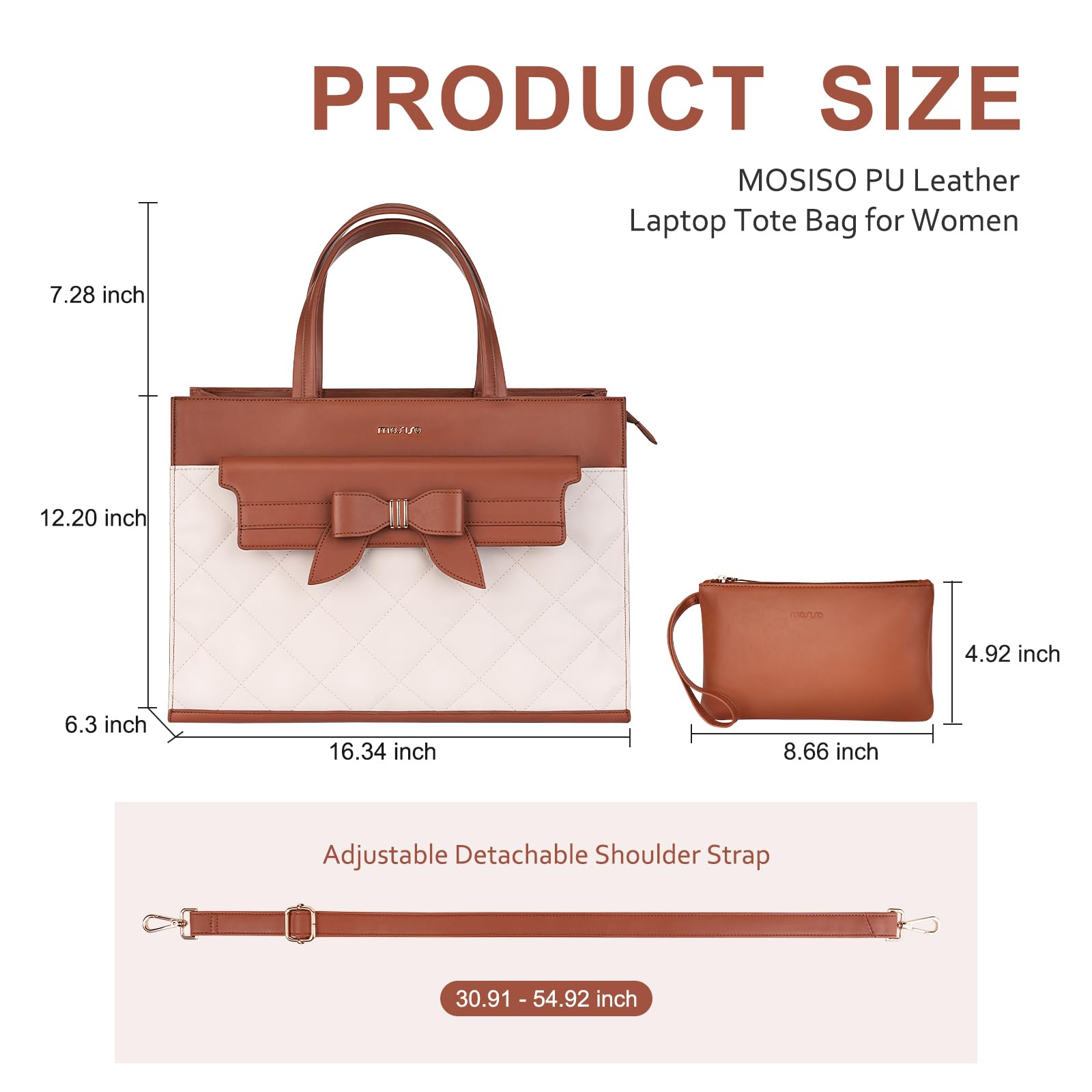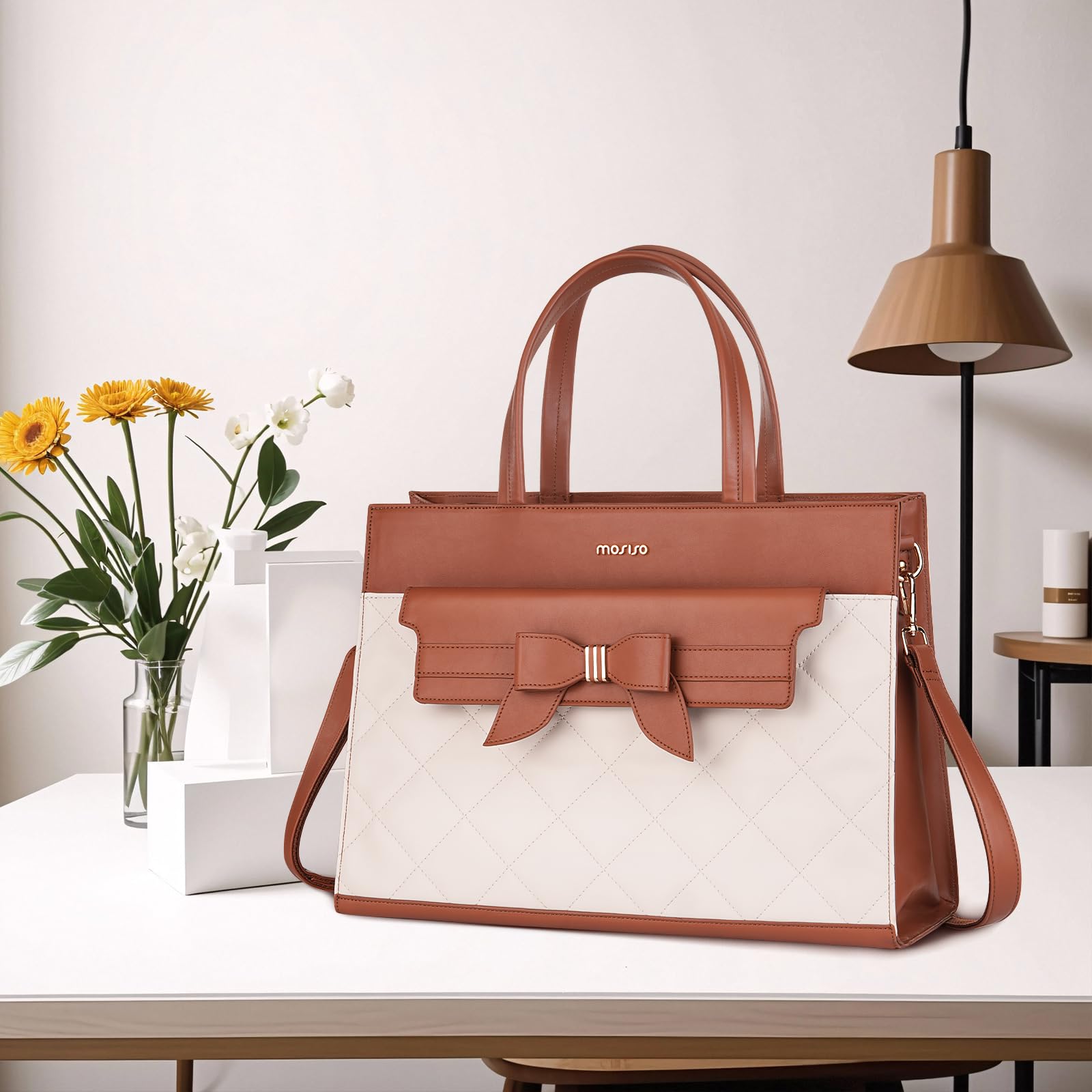 MOSISO Laptop Tote Bag, 15.6 inch PU Leather Flapover Pocket Tote Bag & Clutch Purse, Work Bag with Bowknot for Women, Waterproof Computer Briefcase for Business Office, Brown