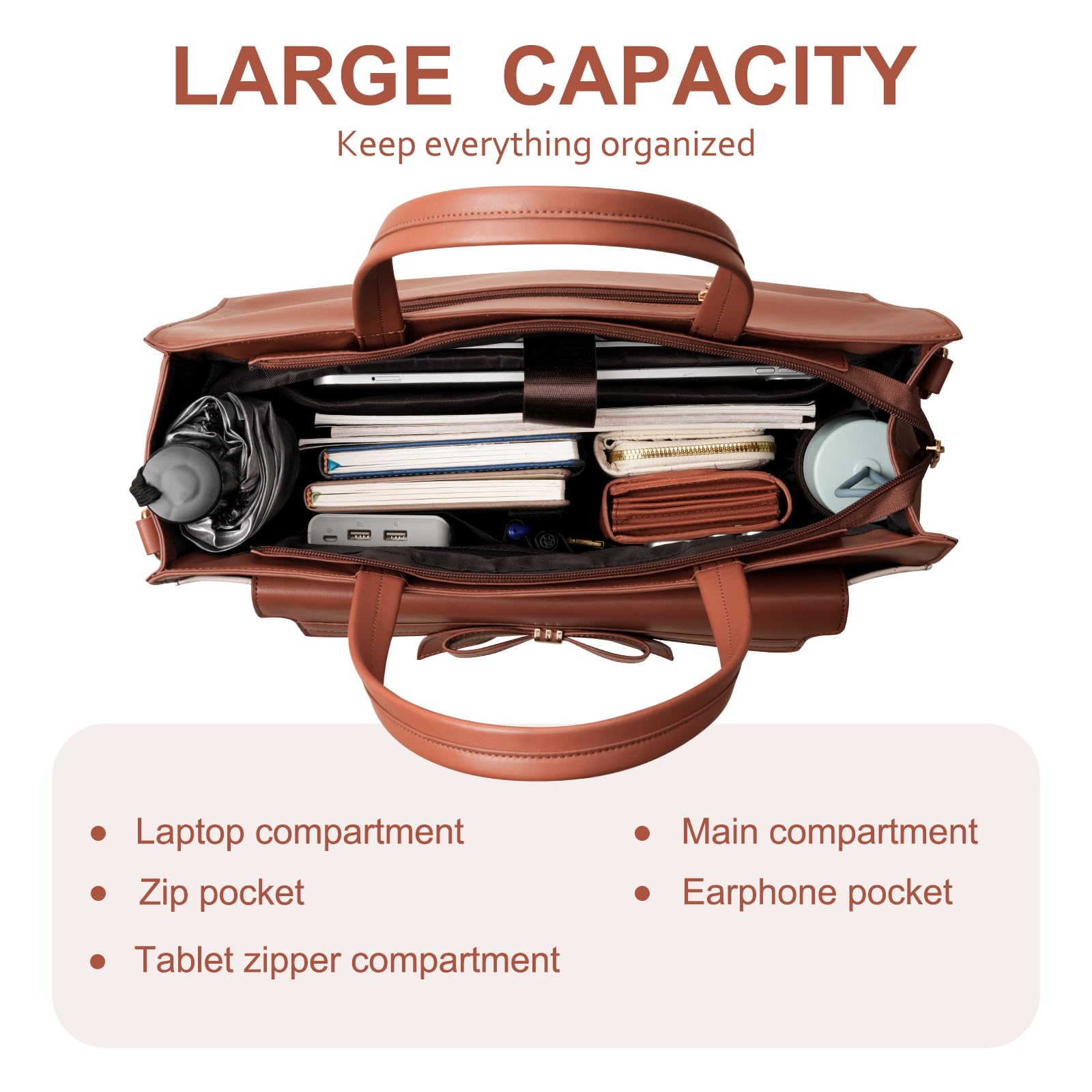 - Large Capacity & Multiple Compartments. This tote bag holds your laptop, tablet documents and book. 3 square pocket, 2 pen pockets; 2 side cup pockets for water bottle inside. Extra small clutch purse to keep your mobile phone, keys, cards, and makeup. Whether you are working, commuting, or daily use, It is an ideal bag for women on the go.