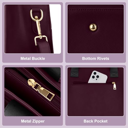 MOSISO Laptop Tote Bag, 15.6 inch PU Leather Tote for Women Professional Handbag with Flapover Pocket&Clutch Purse, Waterproof Shoulder Computer Bag Work Briefcase for Business Office, Plum