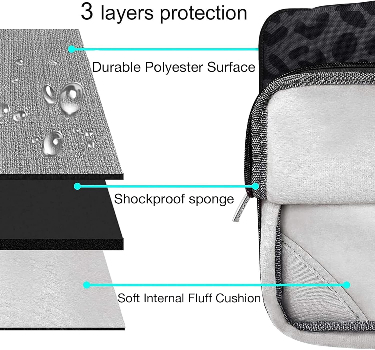 - The 360 degree protective shockproof laptop sleeve carrying bag internal dimension: 12.6 x 0.79 x 8.66 inches (L x W x H); external dimension: 13.19 x 0.79 x 9.25 inches (L x W x H). The front side pocket dimension: 10.8 x 6.5 inches (L x W). Made of leopard grain polyester material, protect your laptop against accidental spills. Slim and lightweight, does not bulk your device up and can easily slide into your briefcase, backpack or other bag. Ideal for business, daily and travel.
