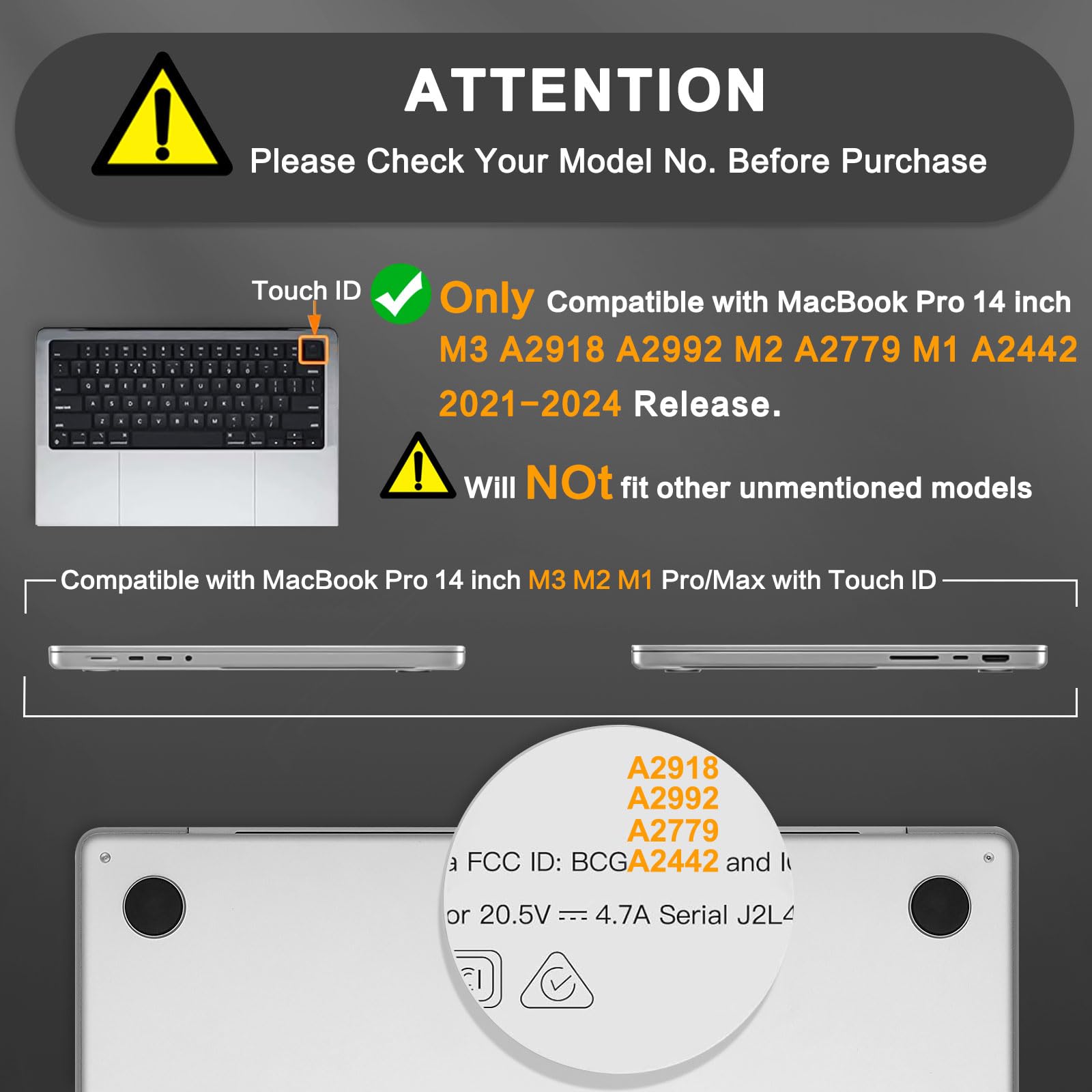 - Please kindly check the model number "Axxxx" on the back of the laptop before your purchase, make sure you choose the exact same model number as the listing title stated "A3112" or "A3185" or "A3401" or "A2918" or "A2992" or "A2779" or "A2442" that compatible with MacBook Pro M4 14 inch case, compatible with MacBook Pro M3 14 inch case, compatible with MacBook Pro M2 14 inch case and compatible with MacBook Pro M1 14 inch case. WARNING: This case is NOT compatible with other model laptops.